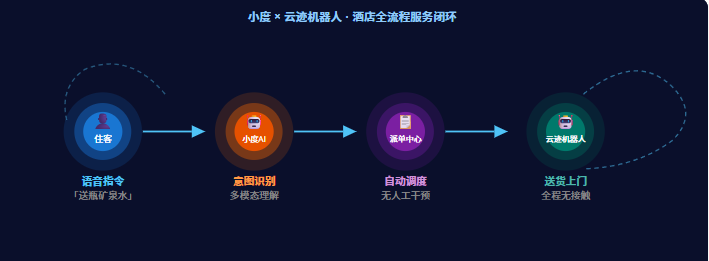 这次,小度把两者连在了一起。住客用小度屏说一句”帮我送瓶矿泉水”,指令会自动派给云迹机器人,机器人接单、取货、送到门口,全程不需要前台介入。