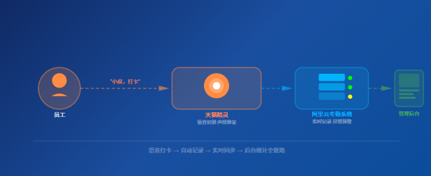 天猫精灵智慧办公考勤流程:员工语音”小度,打卡”→ 天猫精灵声纹识别 → 阿里云考勤系统实时记录 → 管理员后台一键查看统计报表,替代传统刷卡排队,提升打卡效率。